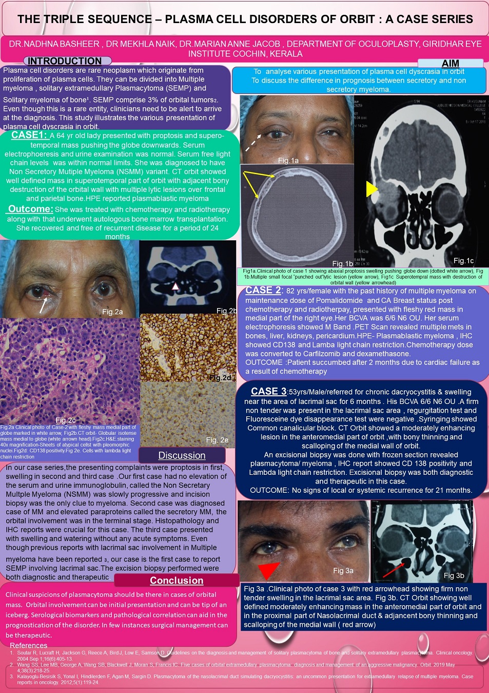 Multiple myeloma , solitary plasmacytoma and solitary myeloma of bone are the spectrum of same disease.This poster describes three cases which have different presentation and varying prognosis.64 yr old presented with superotemporal mass and proptosis. Biopsy reported plasmacytoma and serum electrophoresis had no M band.She recovered and is free of recurrent disease for 24 months period.Another case of an elderly lady with remission of multiple myeloma on chemotherapy presented with mass near medial canthus with positive M band in serum electrophoeresis. Aggressive chemotherapy was initiated, however patient succumbed 2 months after diagnosis. Third case presented with chronic watering and mass over the lacrimal sac region. Surgery under frozen section showed plasmacytoma. Serum electrophoresis had no M band. He recovered and was free of recurrent disease for 18 months.This is the first case of plasmacytoma of nasolacrimal duct reported. Serum biomarkers showed prognostic significance.