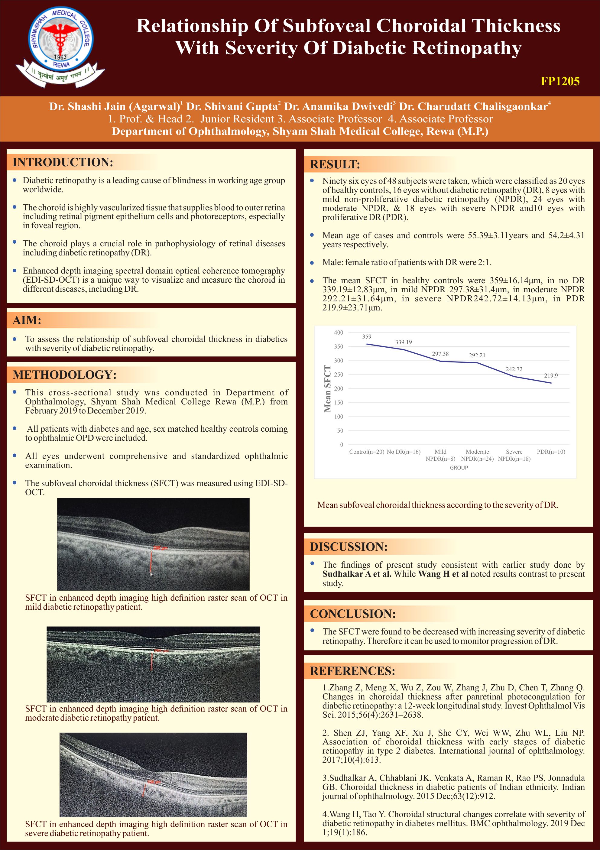 RESULT: Total 96 eyes were taken; Classified as 20 eyes of controls, 16 eyes without diabetic retinopathy (DR), 8 eyes with mild, 24 eyes with moderate, & 18 eyes with severe non-proliferative diabetic retinopathy (NPDR) & 10 eyes with proliferative DR (PDR). Mean SFCT (µm) in control=359, in no DR=339.19, mild NPDR=297.38, moderate NPDR= 292.21, severe NPDR=242.72, in PDR 219.9 & ANOVA test was applied. Significant decrease in SFCT with increasing severity (p<0.001) was observed.CONCLUSION: Decrease SFCT with increasing severity can be used to monitor progression of DR.