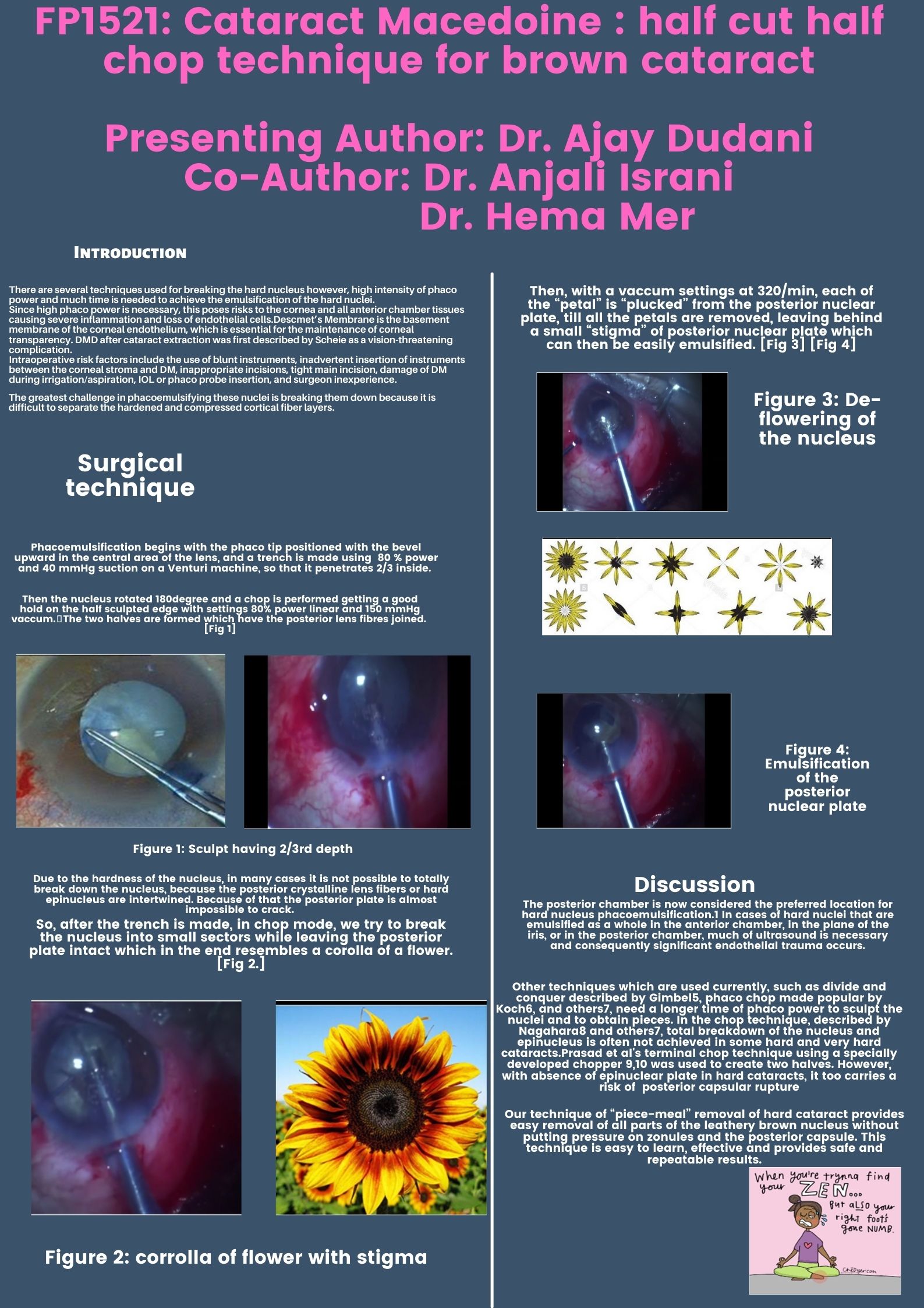 Phacoemulsification in a rock hard nucleus is challenging, even for experienced surgeon. Incidence of capsular-zonular complications, corneal edema wound burn and post-operative inflammation are high. However, surgeon can achieve gratifying results if a proper and effective surgical strategy is adopted.After a careful capsulorrhexis, gentle hydrodissection is done to detach the hard nucleus. A small, eccentric, vertical trench is made by placing the probe in the center and beginning the trench from the center like drawing a radius. This radius is eccentric as we want to divide nucleus into inequal halves. Without cracking, this nucleus is rotated 180 and in “chop” mode, using starting point of trench as “chop-wall”, an attempt to chop smaller half is made. Because of trench behind, this smaller half easily cracks and emulsifies. Once the smaller half is emulsified, there is lot more space in the bag for the bigger half for emulsification. this known as half cut, half chop method.
