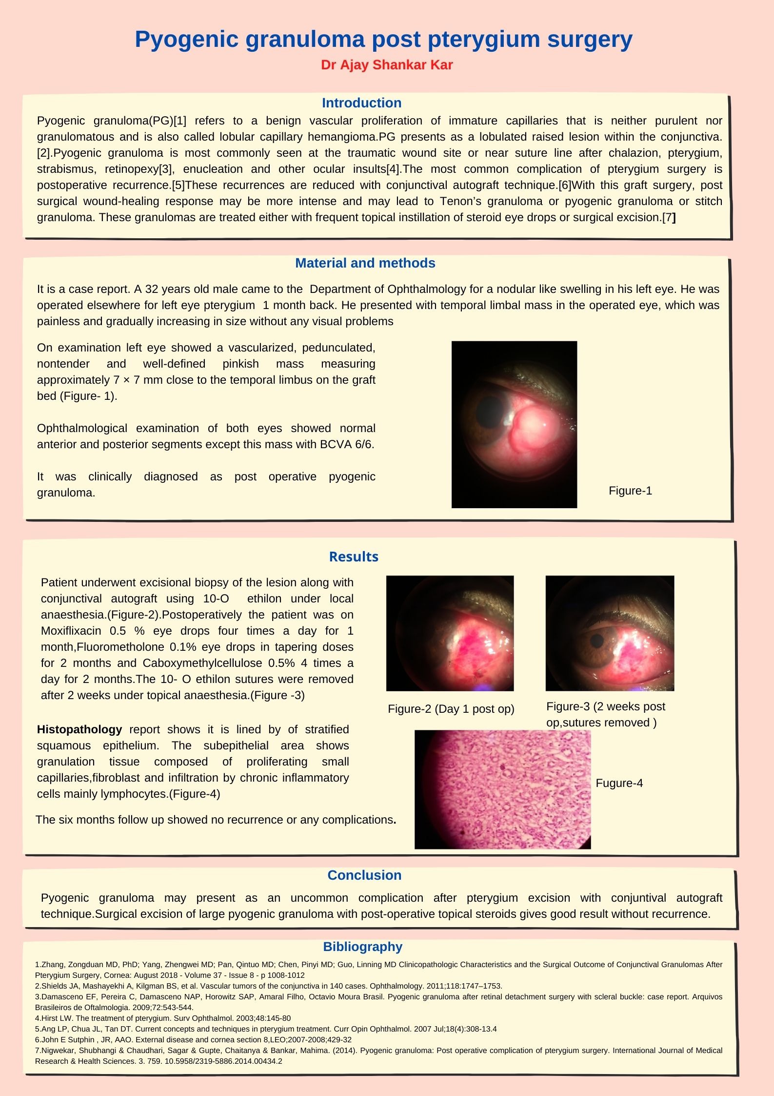 conjunctival autograft surgery on his one month follow up date. The clinical diagnosis was post-operative granuloma and patient underwent excisional biopsy of the mass with conjunctival limbal autograft.Histopathology confirmed the diagnosis of pyogenic granuloma.