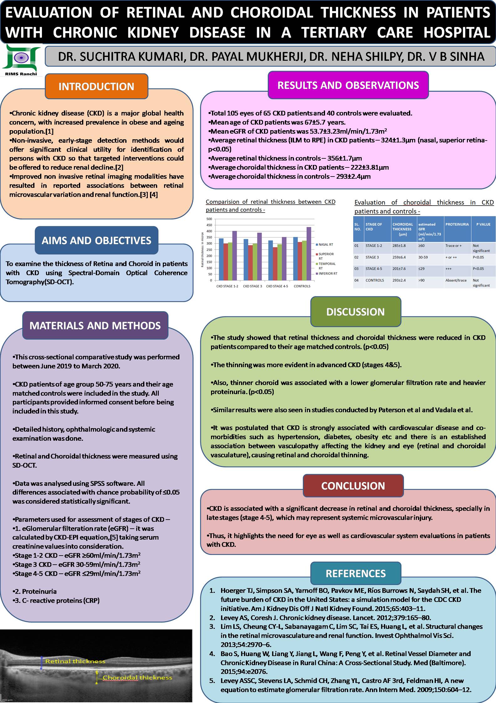 Purpose:To examine the thickness of Retina and Choroid in CKD patients using SD-OCT.Material and methods:CKD patients of age group 50-75 years and their age matched controls were evaluated between June 2019 to March 2020.Detailed history,ophthalmologic and systemic examination was done.Retinal and Choroidal thickness were measured using SD-OCT.Results:105 eyes of 65 CKD patients and 40 controls were evaluated.Retinal thickness (p<0.05) and Choroidal thickness (p<0.01) were reduced in CKD patients compared to their age matched controls.The thinning was more evident in advanced CKD (stages 4&5).Also,thinner choroid was associated with a lower glomerular filtration rate (p<0.01),heavier proteinuria(p<0.01) and an increased plasma level of C-reactive protein.Conclusion:CKD is associated with a decrease in retinal and choroidal thickness which may represent systemic microvascular injury.Thus highlighting the need for eye as well as Cardiovascular system evaluations in patients with CKD