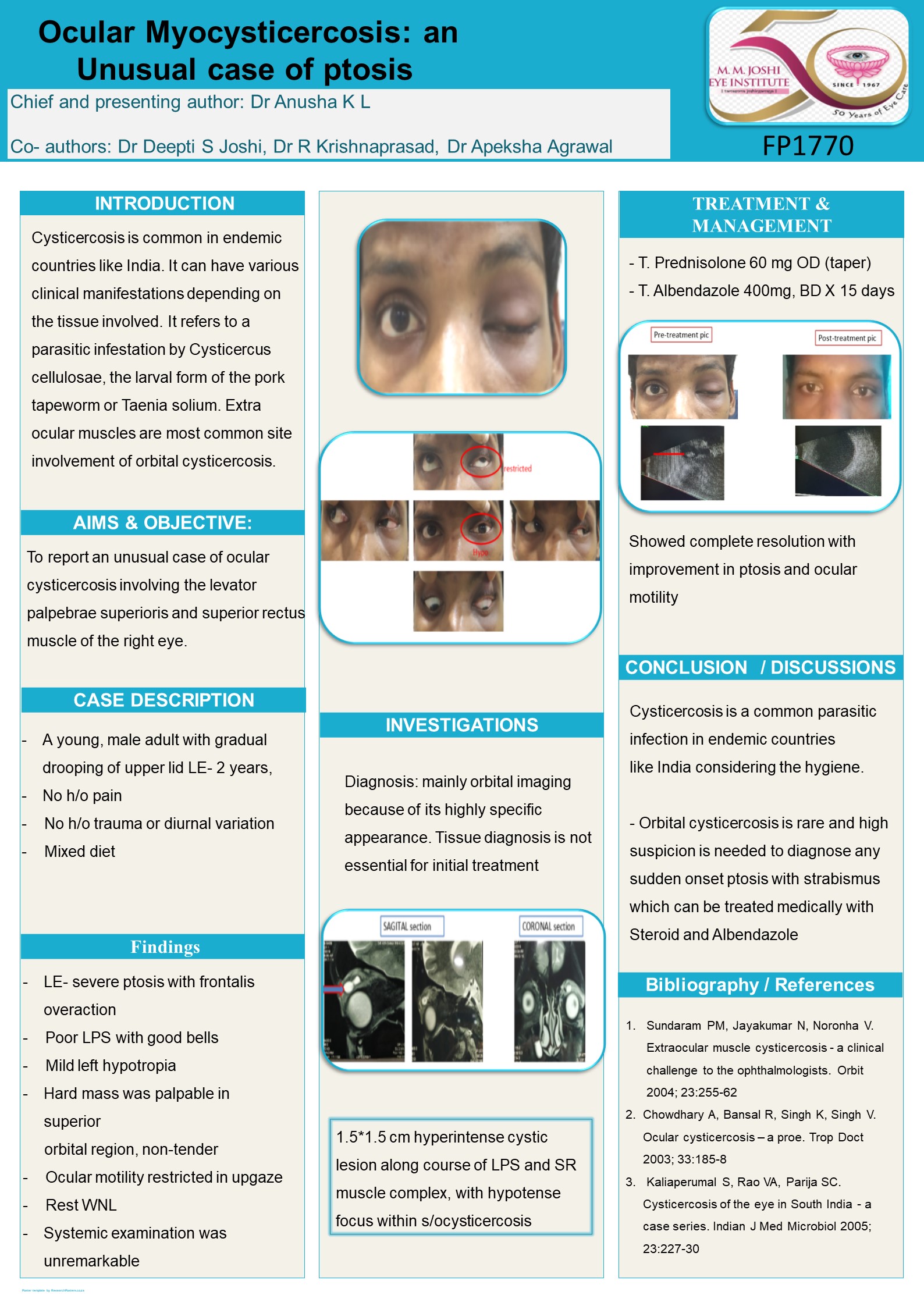 ocular motility in the left upward gaze & severe ptosis. Bells phenomenon good. MRI orbit showed a cystic lesion in SR-LPS complex s/o ocular cysticercosis. The patient was treated with