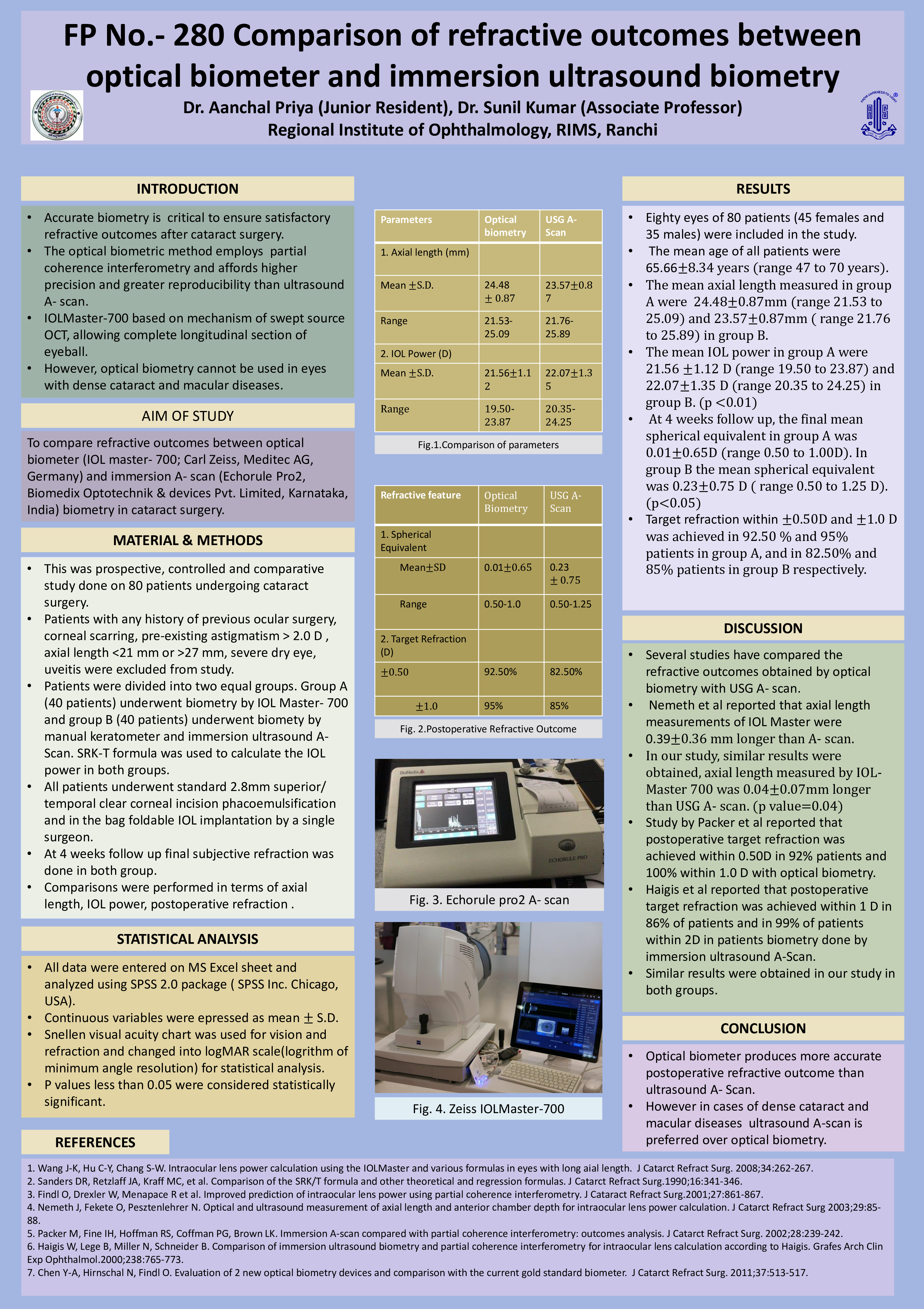 Methods: 80 patients planned for cataract surgery were divided into 2 groups. Group A (40 pts) underwent biometry by IOLMaster-700 and group B (40 pts) by manual keratometry and immersion A- Scan. All pts underwent 2.8mm clear corneal phacoemulsification. The IOL material, design, and IOL formula were standardized. Postoperative refractive outcomes and error were compared.