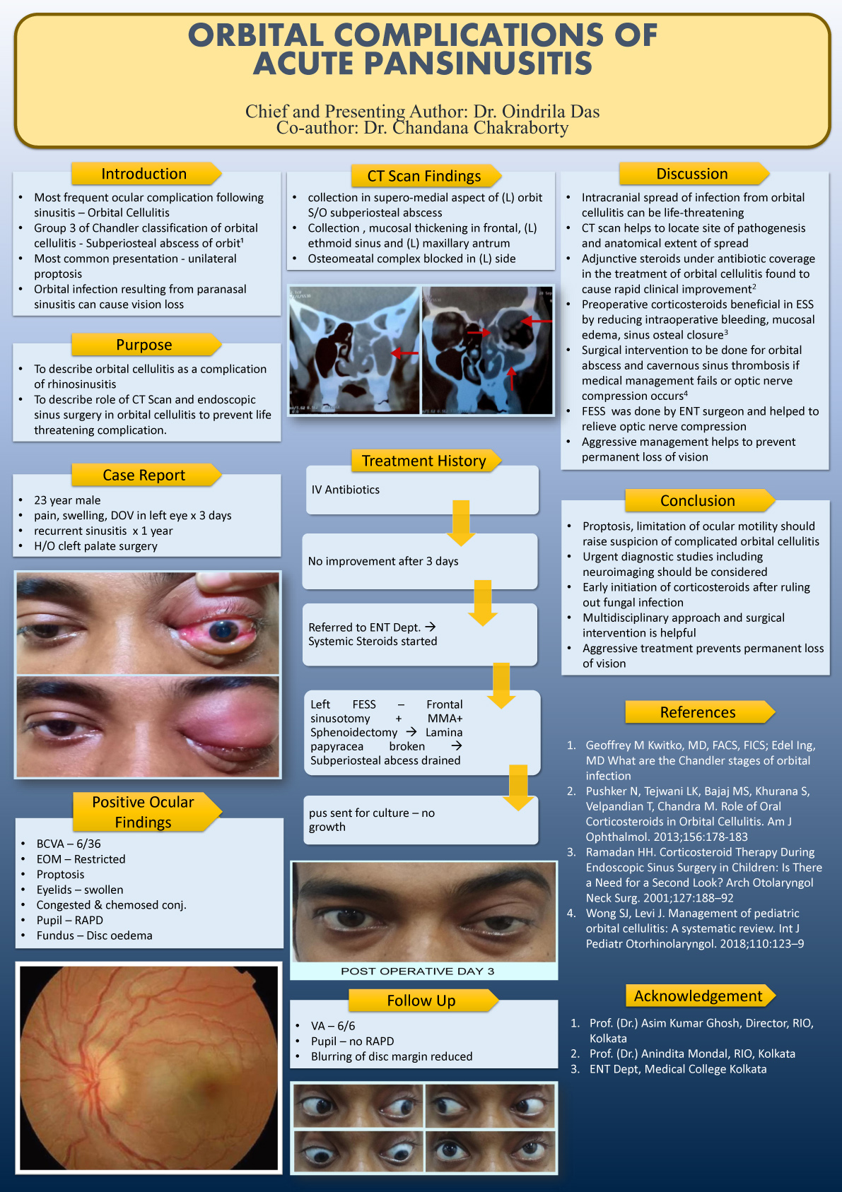 Case Report:A 23-year-old male with left eye pain, swelling, proptosis and dimness of vision (DoV) had restricted extraocular motility (EOM) and relative afferent pupillary defect with blurred disc margin. Based on CT scan suggesting subperiosteal abscess of orbit due to pansinusitis and no response to systemic antibiotics,endoscopic sinus surgery (ESS) was done by ENT surgeon leading to rapid recovery of symptoms and vision.