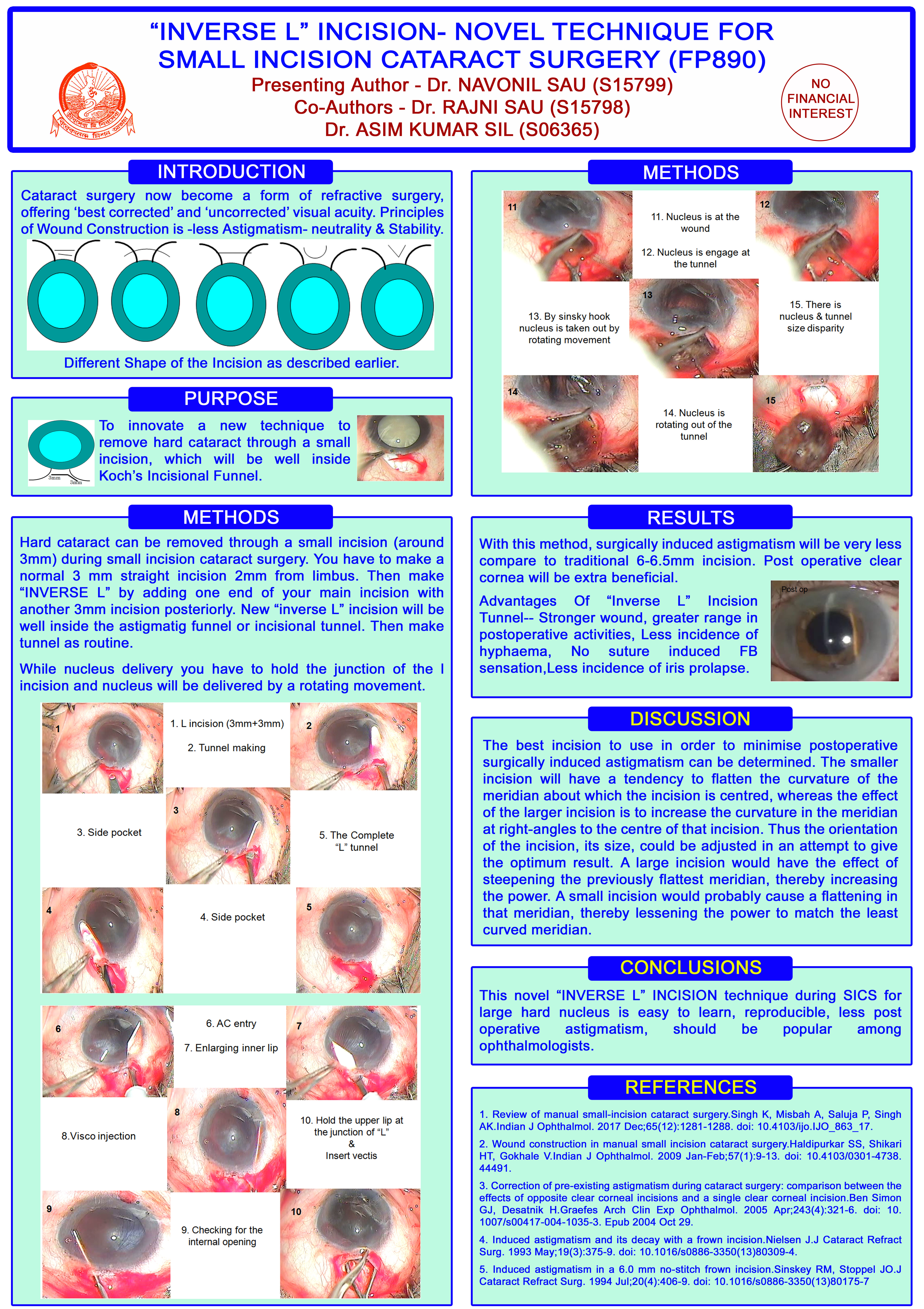 Purpose: to innovate a new technique to remove hard cataract through a small incision. Method: hard cataract can be removed through a small incision (around 3mm) during small incision cataract surgery. You have to make a normal 3 mm straight incision 2mm from limbus, then make “INVERSE L” by adding one end of your main incision with another 3mm incision posteriorly. New “INVERSE L” incision will be well inside the astigmatig funnel or incisional tunnel. Then make tunnel as routine. While nucleus delivery you have to hold the junction of the L incision and nucleus will be delivered by a rotating movement. Result: with this method, surgically induced astigmatism will be very less compare to traditional 6-6.5mm incision. Post operative clear cornea will be extra beneficial. Conclusion: this novel “INVERSE L” INCISION technique during SICS for large hard nucleus, is easy to learn, reproducible with less post operative astigmatism, should be popular among ophthalmologists.
