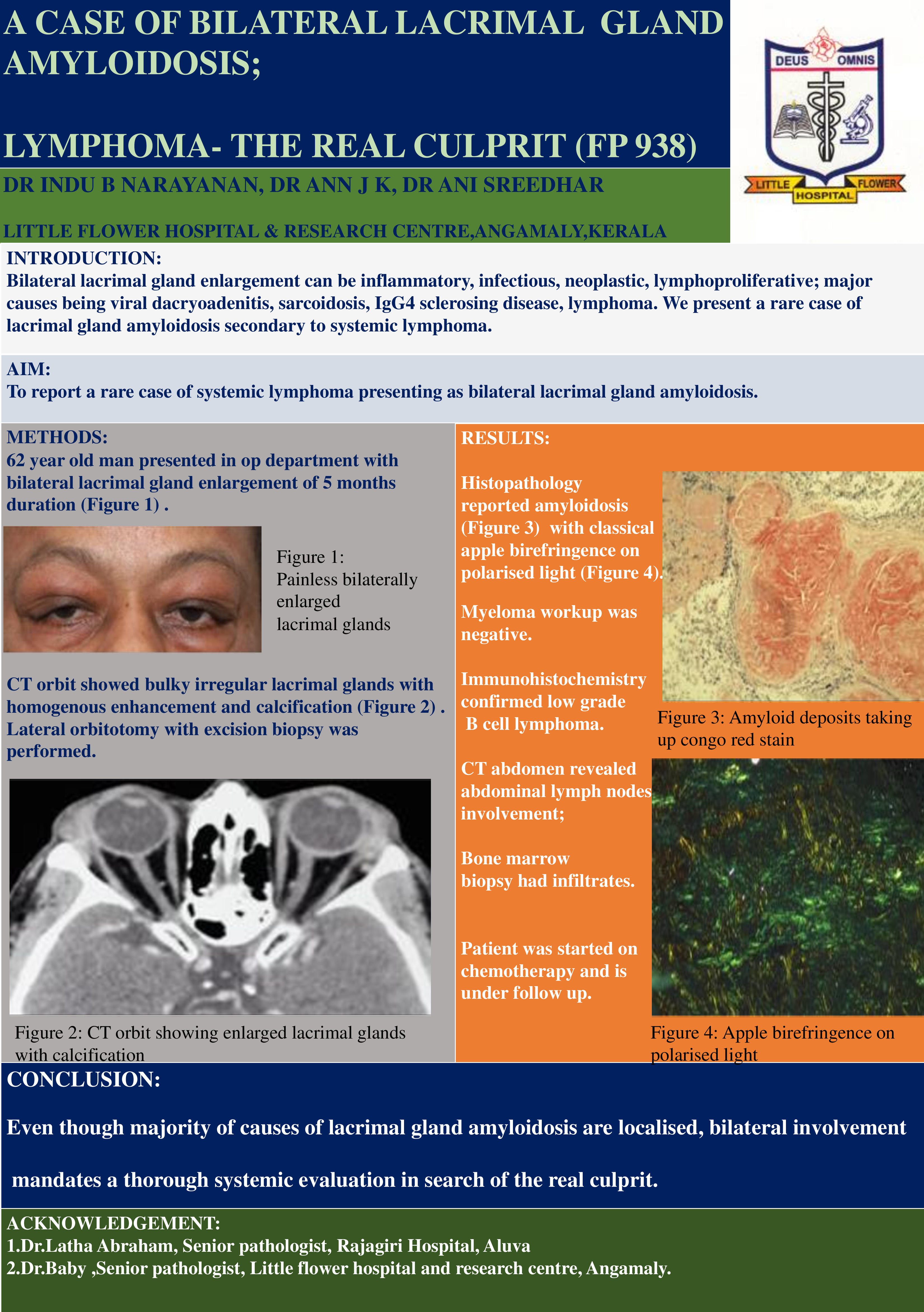 62 year old man presented with bilateral lacrimal gland enlargement of 5 months duration.CT orbit showed bulky irregular lacrimal glands,with homogenous enhancement and calcification.Lateral orbitotmy with excision biopsy was done.Histopathology reported amyloidosis with classical apple birefringence on polarised light.Myeloma work up was negative.Immunohistochemistry revealed low grade Bcell lymphoma.CT abdomen revealed abdominal lymph nodes involvement.Bone marow biopsy showed infiltrates.Patient has been started on chemotherapy and is under follow up.